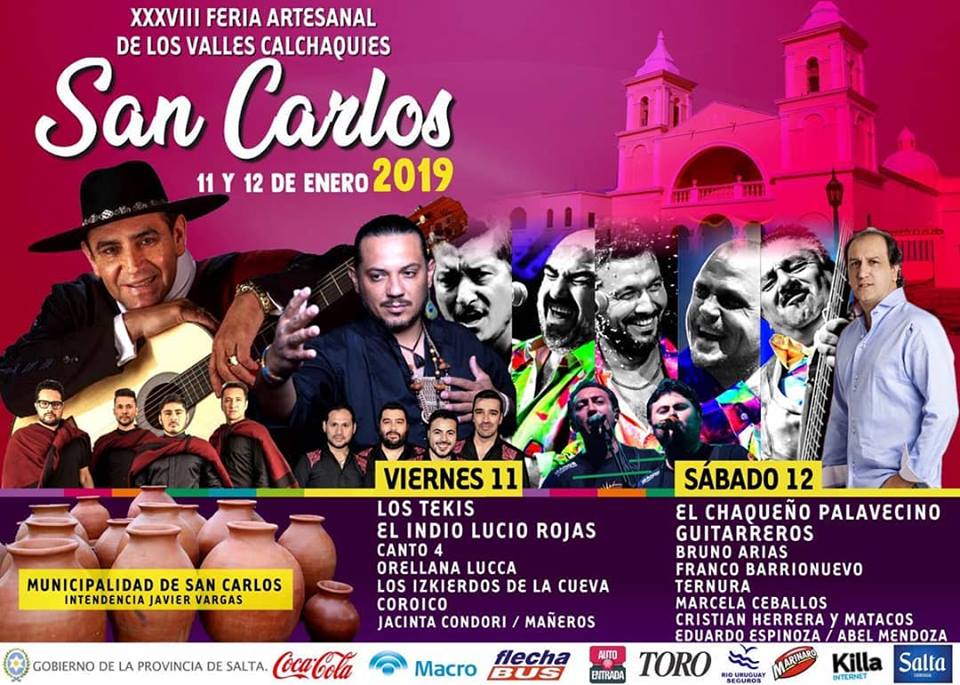 Para la temporada de verano 2019, y siguiendo con el calendario turístico, el viernes 11 y el sábado 12 de enero, se realizará la trigésima octava edición de la Feria Artesanal de los Valles Calchaquíes en San Carlos. El festival tendrá a Los Tekis y a Oscar Esperanza El Chaqueño Palavecino como figuras estelares.